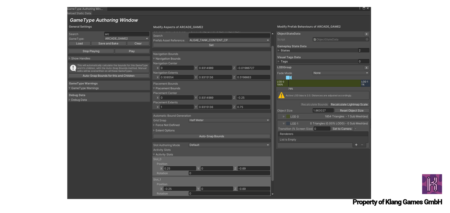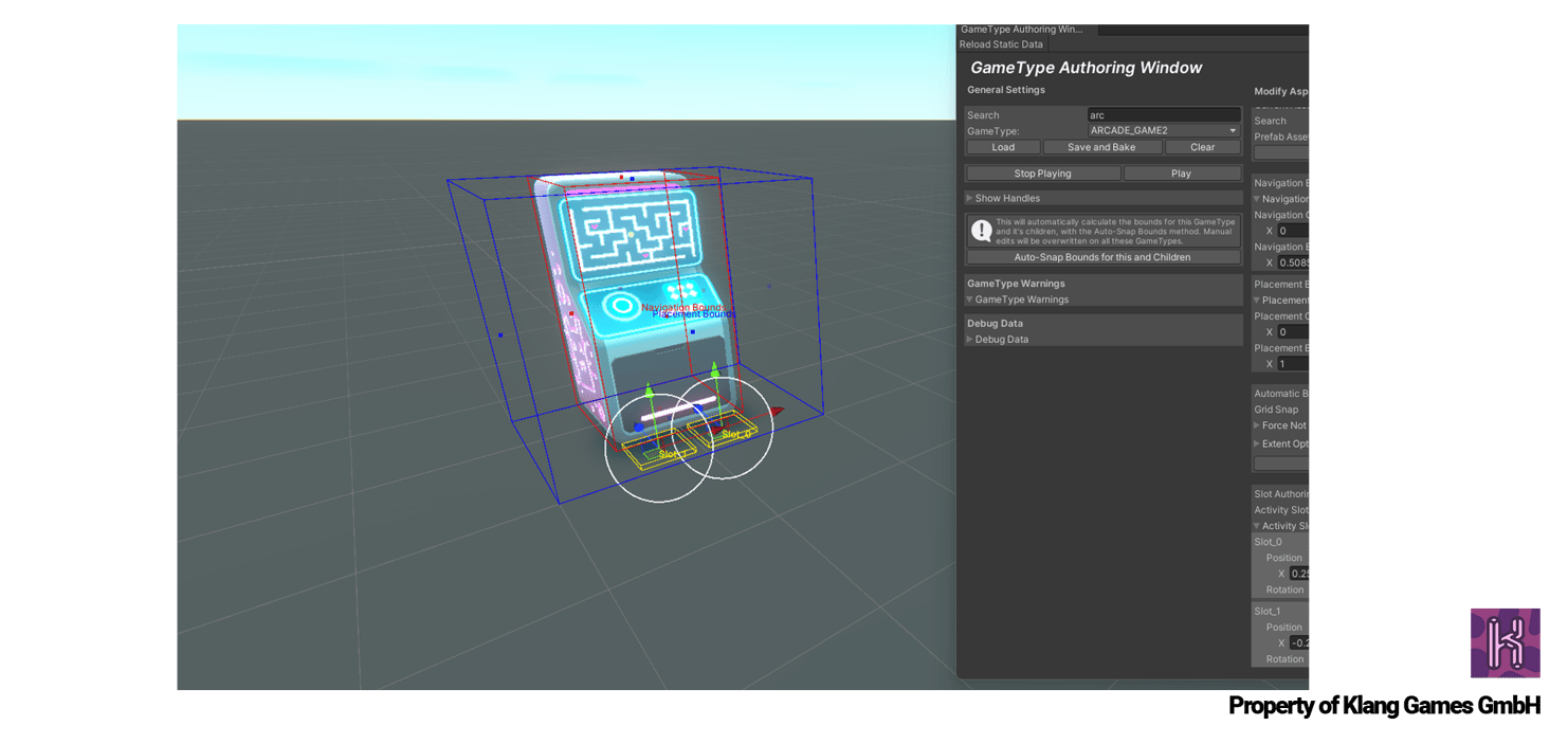The GameType Authoring Window is a Unity tool, which is capable of loading our Static Game Data into visual representations in Unity. this allows Content Designers to define Activity Slots, Placement and Navigation Bounds, as well as Container Slots for Objects in the Game. The Tool is able to play animations and sound on those Objects making it perfect to tweak prefabs alongside.